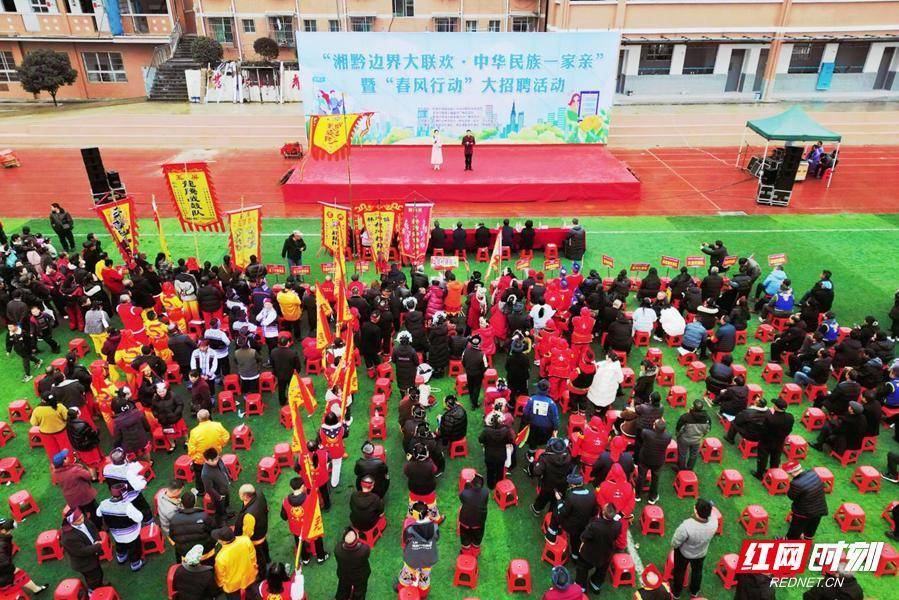 红网时刻新闻记者 雷文霞 通讯员 杨秀金 怀化报道早春二月,㵲水河畔,生机盎然。2月28日,农历正月十二,位于湘黔两省交界处的新晃侗族自治县林冲镇热闹非凡。以“湘黔边界大联欢·中华民族一家亲”为主题的“春风行动”大招聘活动在这里启幕。这是一场跨越省界的招工盛会,更是一次多民族文化交流交融的狂欢。来自湖南新晃及贵州大龙、玉屏等地的数千名群众欢聚林冲学校,在隆隆的锣鼓声与热烈的划拳令中,共同绘就了一幅“边界无界、民族同心、发展共融”的生动实景。跨省“春风”吹暖就业路:从“单向输出”到“双向奔赴”上午9时许,林冲学校的田径场上已是人头攒动。春寒料峭,却挡不住求职者们的热情。与往年不同的是,今年的招聘现场不再只是企业单向设摊、求职者被动应聘,而是呈现出一种供需精准对接、双向互动的火热局面。