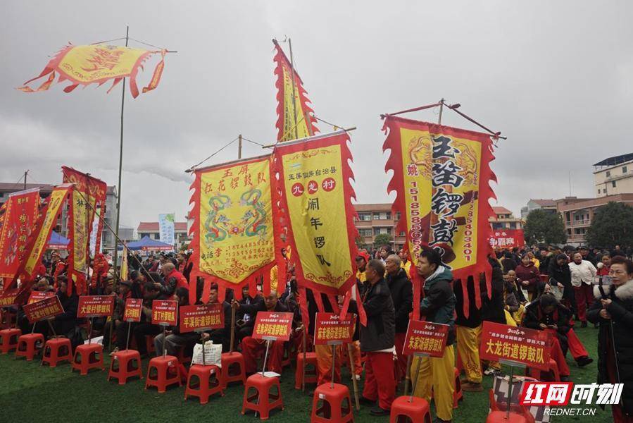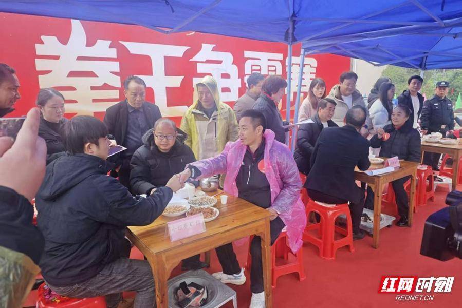 10时许,伴随着一阵激昂的锣鼓声,“返乡创业闹新春”锣鼓大赛激情开赛。来自新晃晃州镇、凉伞镇、扶罗镇、鱼市镇、林冲镇、米贝苗族乡,贵州大龙街道、麻音塘街道、皂角坪街道、朱家场镇的16支队伍同台竞技,气势恢宏。参赛队伍以村为单位,队员多是返乡过年的务工人员,他们把在外打拼的精气神,融入这传统的锣鼓声中。比赛现场,鼓手们身着绚丽的民族盛装,手中的鼓槌上下翻飞,队旗在空中迎风飘扬。大鼓与锣钹交织共鸣,鼓点时而急促如万马奔腾,时而舒缓如溪水潺潺。震天动地的锣鼓声,不仅敲出了边界群众昂扬向上的精神风貌,更敲响了乡村振兴的奋进鼓点。评委们根据表演形式、服装效果、精神面貌等进行现场打分。经过激烈角逐,晃州镇塘家坝锣鼓队摘得桂冠,凉伞镇偏洞村双龙锣鼓队获得亚军,林冲镇林冲村锣鼓队获得季军。这种“以鼓交友、以锣会邻”的形式,将两地群众的心紧紧连在了一起,让文化的血脉在省界间畅通流淌。林冲镇党委书记杨荣梓在现场深有感触地表示:“我们举办这个活动,就是想让湘黔边界从‘地域相邻’走向‘发展相融’,从‘民俗相通’迈向‘民生相依’。”锣鼓声中,边界群众不仅闹出了新春的喜庆,更闹出了同心共筑美好未来的精气神。拳王争霸“赛”出团结情:8路豪强以酒令诠释“湘黔一家亲”锣鼓的余韵尚未散去,下午1时,“新春拳王争霸赛”又准时点燃了现场的热情。